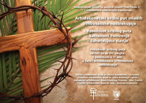 Dragi čitatelju! Ovdje možeš pronaći sve materijale pripravljene za Arhiđakonatski križni put mladih Vrhbosanske nadbiskupije koji se ove godine održava 09. ožujka 2024., s početkom u 11 sati u cijeloj Vrhbosanskoj nadbiskupiji. Prvi put križni put mladih organizira se na četiri mjesta u isto vrijeme. Prema preporukama nadbiskupa vrhbosanskog mons. Tome Vukšića, Vijeća za mlade …