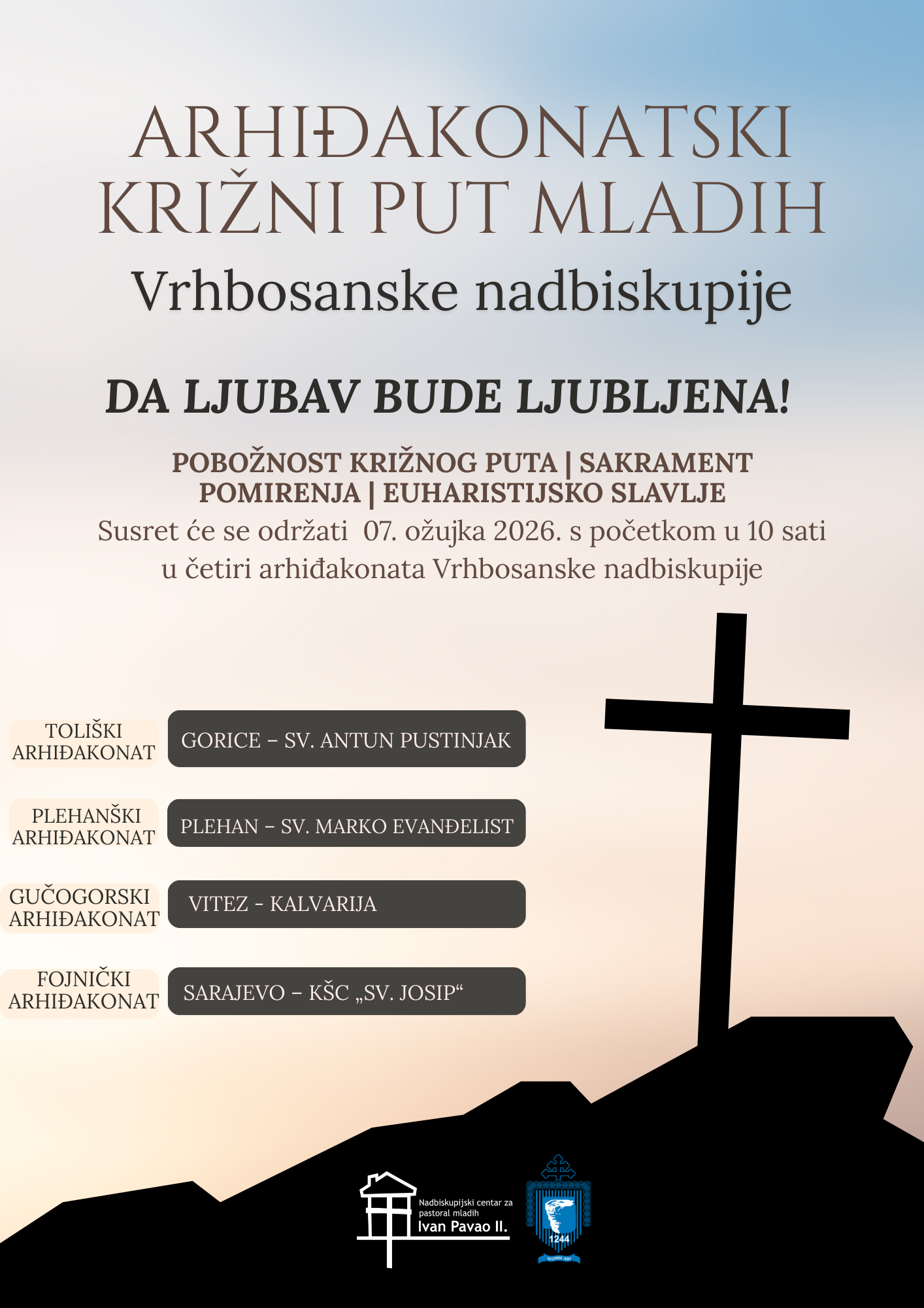 Ovdje možete pronaći sve materijale pripravljene za Arhiđakonatski križni put mladih Vrhbosanske nadbiskupije koji se ove godine održava 07. ožujka 2026., s početkom u 10 sati u cijeloj Vrhbosanskoj nadbiskupiji.