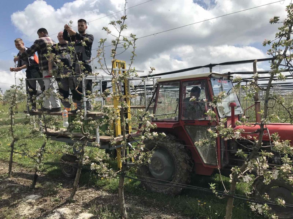 U praktičnom dijelu edukacije, u voćnjaku, polaznici su imali priliku vidjeti suvremeni način navodnjavanja kroz sistem kap po kap i protugradne mreže koje su najučinkovitiji način zaštite voćnjaka od leda. U nastavku im je profesorica Gorana pokazala potkornjaka u mirisnim lovnim klopkama koje su sami polaznici na prethodnim edukacijama postavljali u voćnjaku. Polaznici su se najduže zadržali na platformi kako bi privezali vrhove sadnica uz žicu.