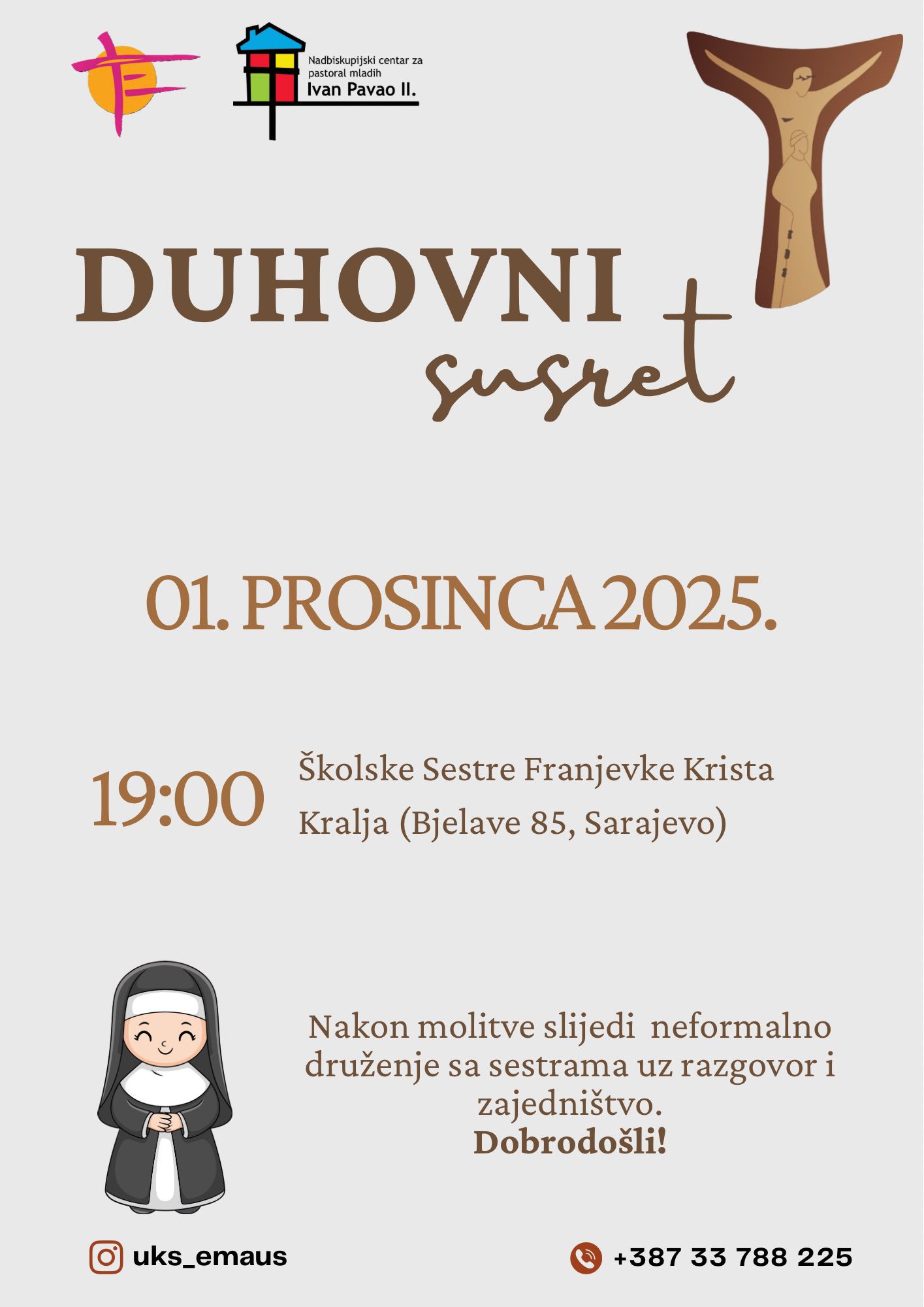 Dragi mladi,Udruga katoličkih studenata Emaus poziva vas na duhovni susret koji će se održati u ponedjeljak 01.12. u samostanu Školskih sestara franjevki na Bjelavama, s početkom u 19:00 sati. Susret će se sastojati od klanjanja pred Presvetim te neformalnog druženja nakon molitvenog dijela. Ovo je prilika da se smirite, saberete i obnovite u Božjoj prisutnosti, …
