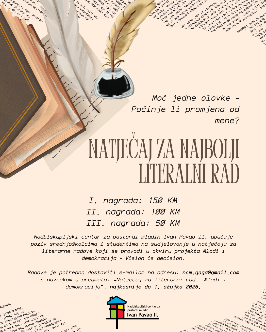Nadbiskupijski centar za pastoral mladih Ivan Pavao II. upućuje poziv srednjoškolcima i studentima na sudjelovanje u natječaju za literarne radove koji se provodi u okviru projekta Mladi i demokracija – Vision is decision.