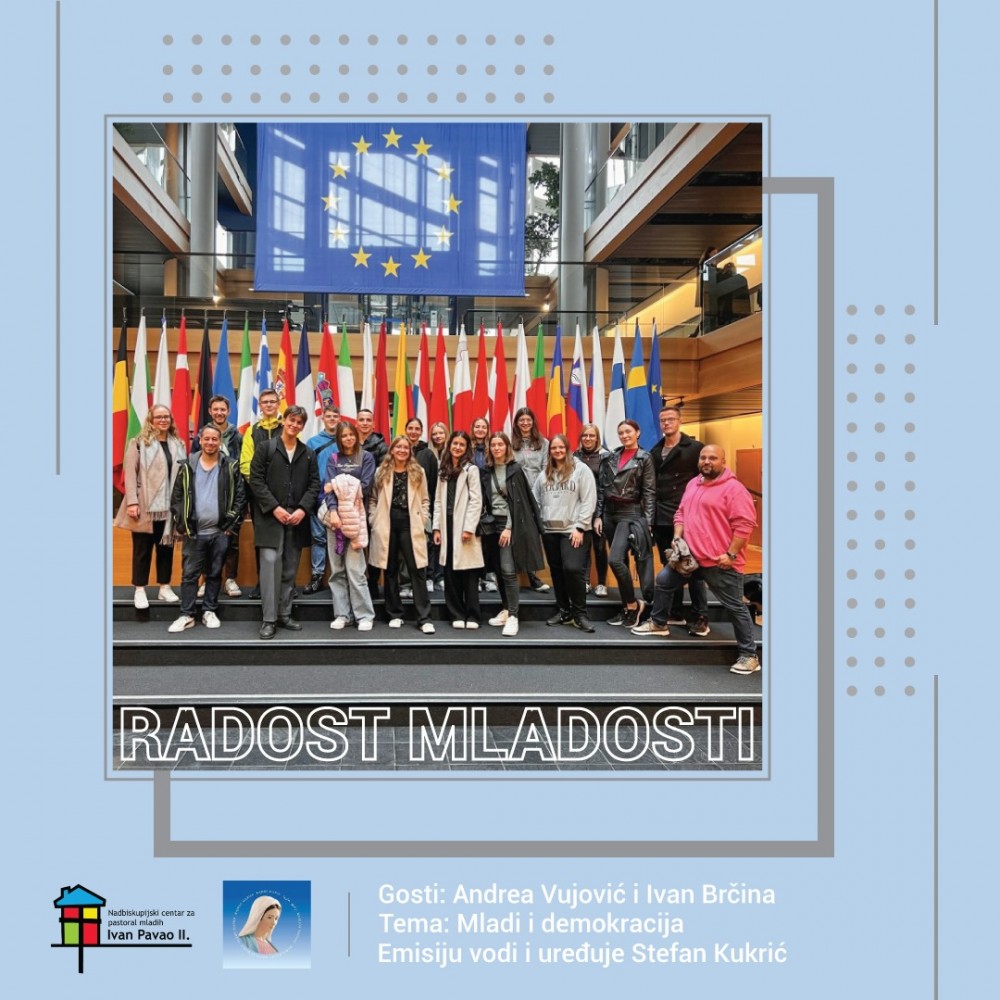 U trećoj epizodi nove sezone emisije Radost mladosti, razgovarali smo o projektu Nadbiskupijskog centra za pastoral mladih Ivan Pavao II – Mladi i demokracija. Gosti ovotjedne epizode su vršnjački edukatori Andrea Vujović i Ivan Brčina. Gosti su govorili o samom projektu i projektnim aktivnostima, o demokraciji općenito, te o odnosu mladih prema demokraciji. Gosti su također govorili i o iskustvu međunarodne razmjene mladih u Njemačkoj i Francuskoj na kojoj su sudjelovali, a koja je održana u sklopu spomenutog projekta.