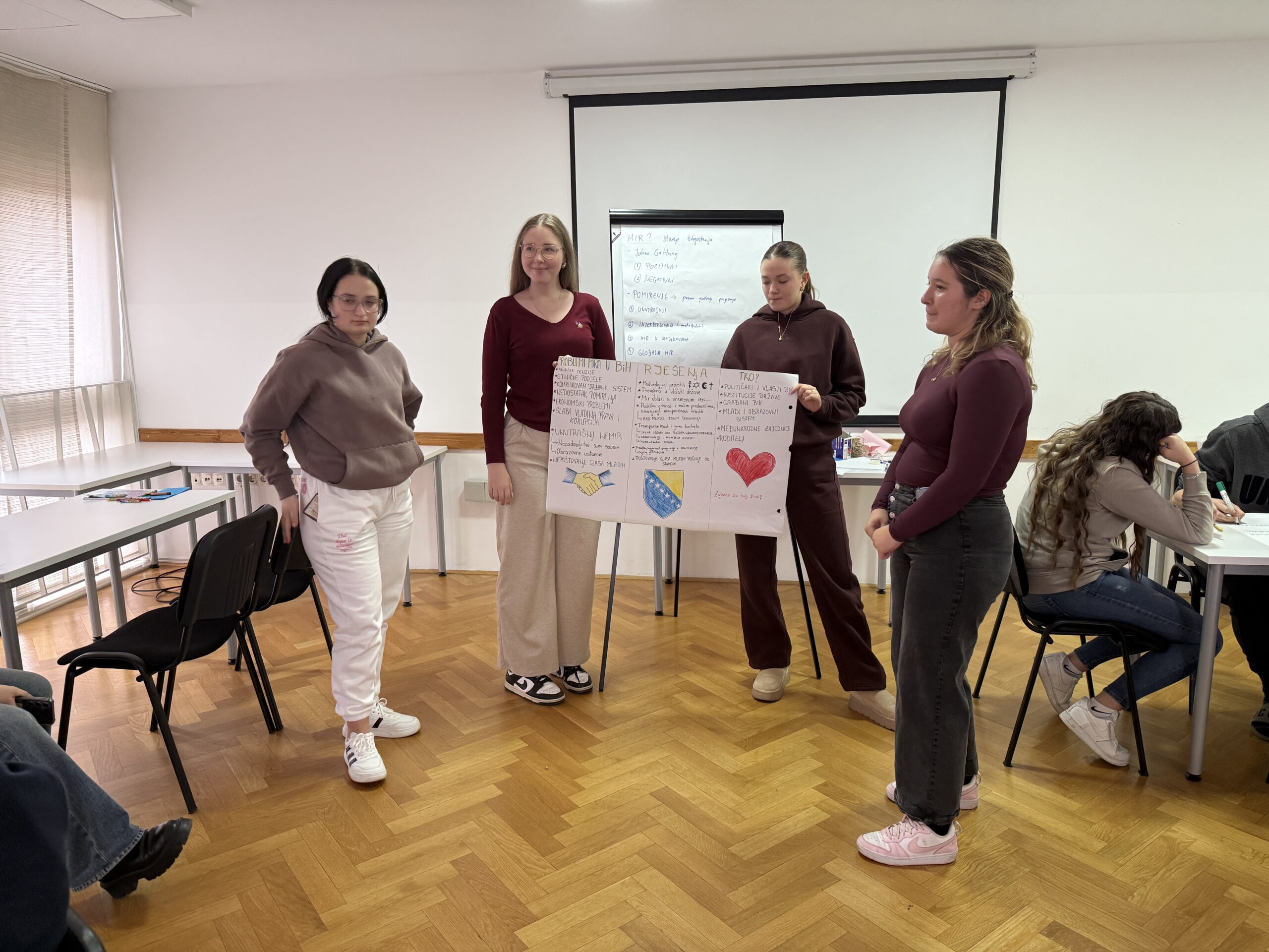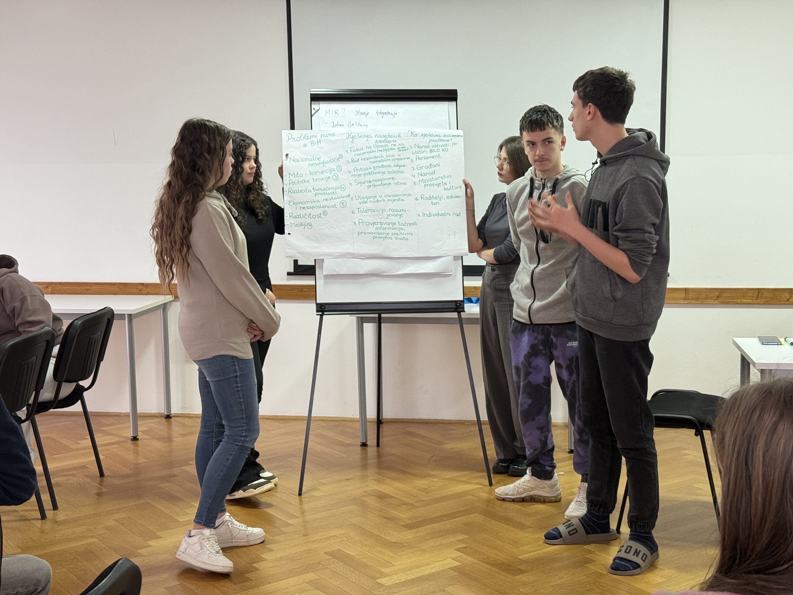 Drugoga dana fokus je stavljen na društveni angažman mladih kroz simulacijsku vježbu Tko i kako donosi odluke?, u kojoj su učenici, radeći na studijama slučaja iz stvarnog života, tražili rješenja za izazove lokalne zajednice – od kriznih situacija do pitanja javnog interesa i odgovornosti institucija. U nastavku dana izlaganje na temu Između ustavnog mira i stvarnog pomirenja: uloga mladih u povezivanju društva BiH održala je Nadira Ćurulija uz poseban naglasak na važnost dijaloga, povjerenja i osobne odgovornosti u procesu pomirenja. Kroz popodnevne radionice mladi su dodatno razvijali kritičko promišljanje o odnosu nastavnika i učenika te ulozi ocjenjivanja, formulirajući konkretne preporuke za bolju komunikaciju u školskom okruženju.