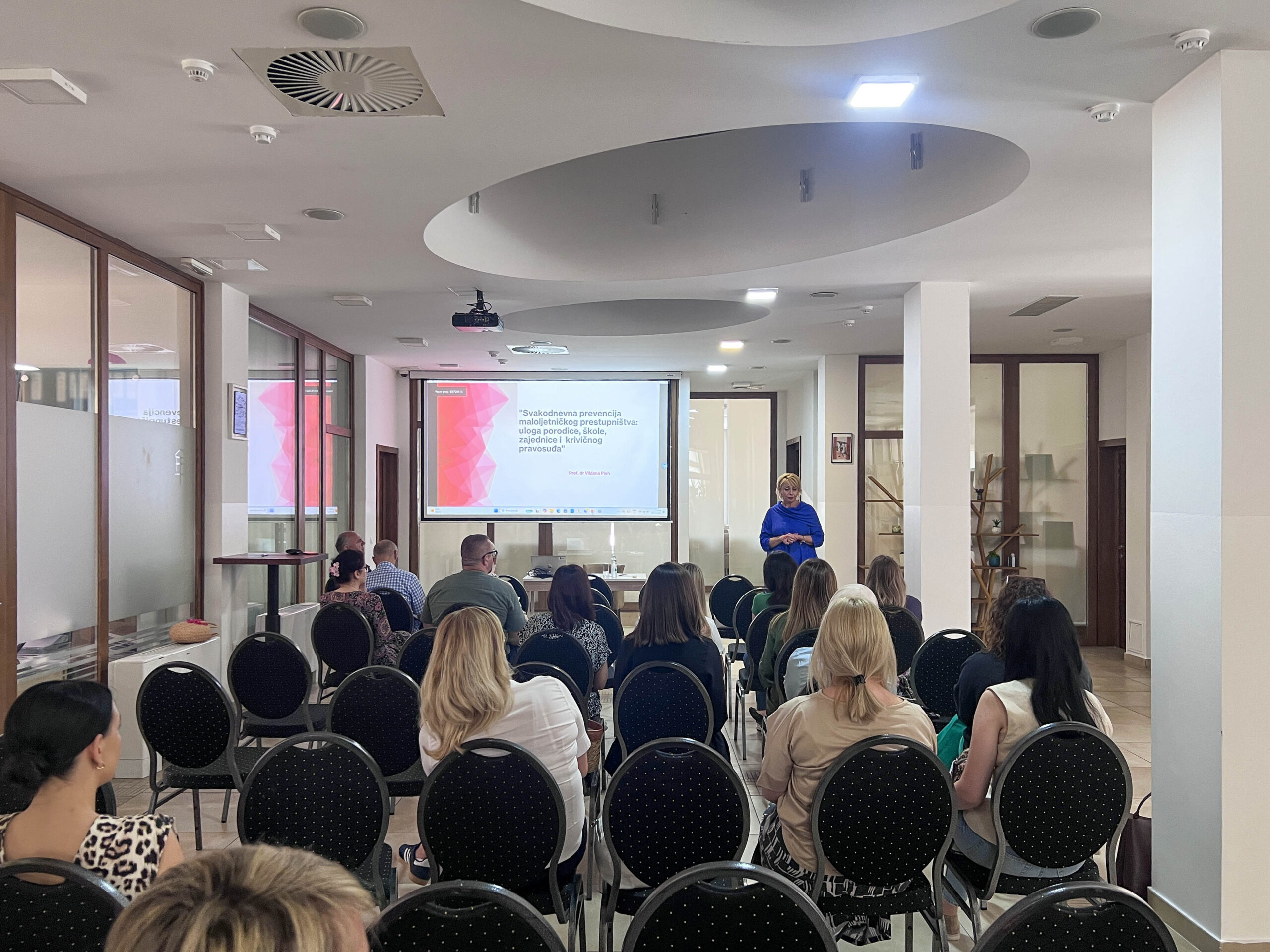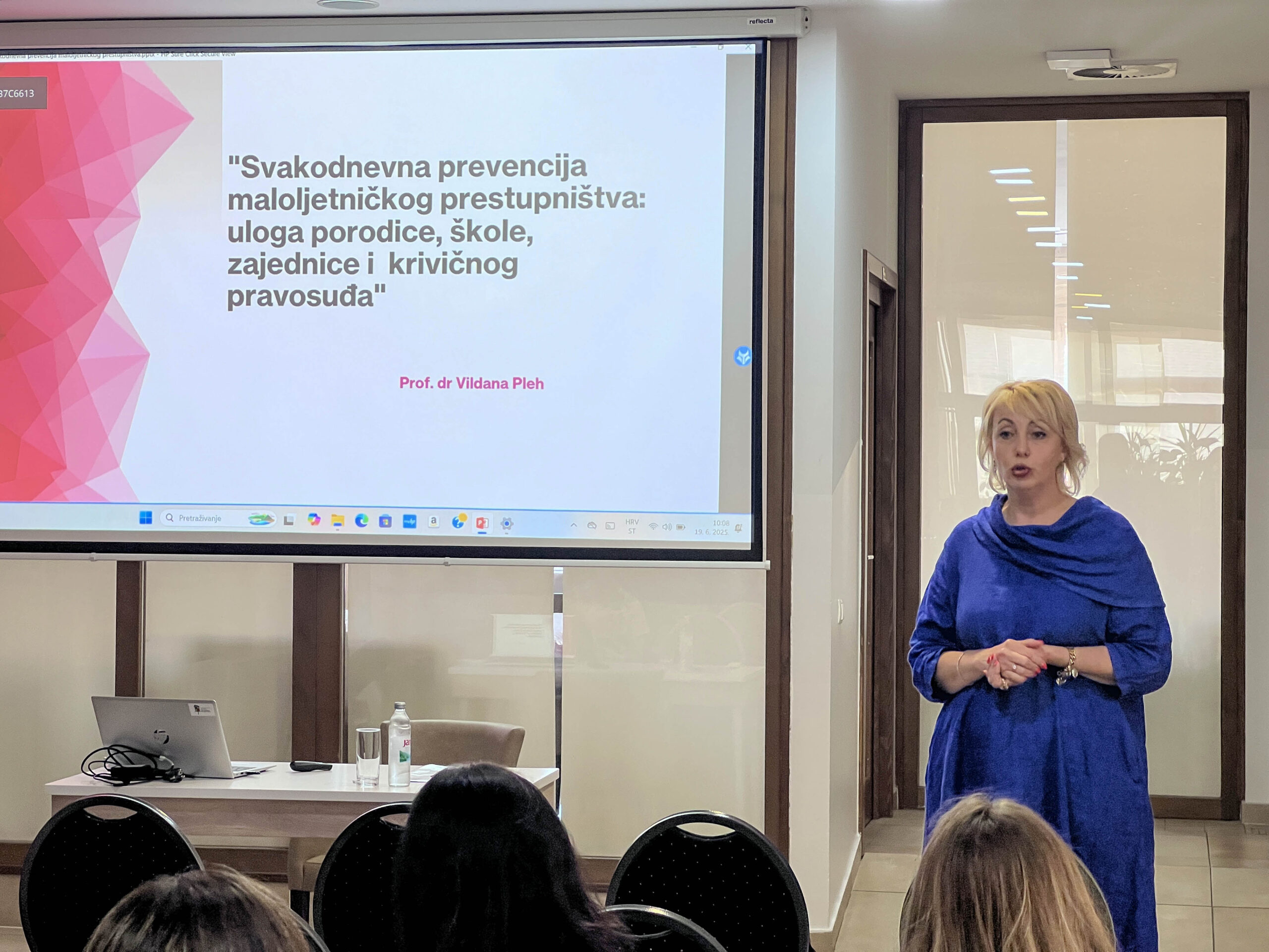 Predavanje je održala prof. dr. Vildana Pleh, vanredna profesorica na Pravnom fakultetu Univerziteta u Sarajevu te istaknuta stručnjakinja u području kriminologije i prava djece i maloljetnika. Tijekom svoje bogate karijere, prof. dr. Pleh je radila na brojnim edukativnim i istraživačkim projektima usmjerenim na razvoj preventivnih programa. Njeno akademsko i profesionalno iskustvo, kao i predanost zaštiti djece u riziku, čine je jednom od vodećih liderica u ovom području u Bosni i Hercegovini.