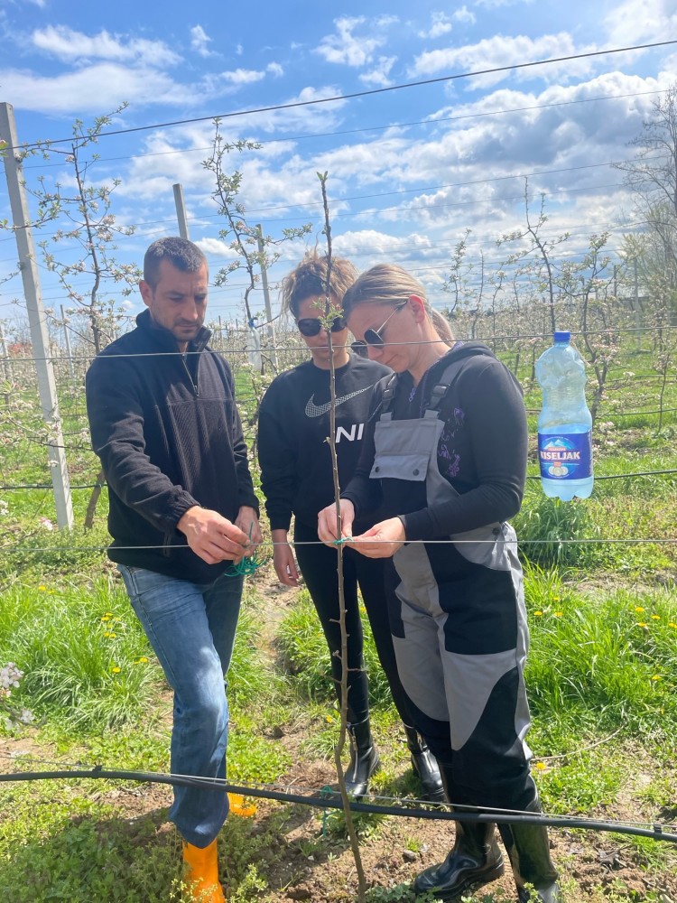U praktičnom dijelu edukacije polaznici su najprije upoznati s voćarskim vezivom-PVC bužir koje se koristi u voćarstvu i vinogradarstvu. Radi se o posebnoj vrsti veziva koje se zbog svoje elastičnosti neće urezati u grane i deblo voćaka njihovim razvojem. Uz pomoć veziva polaznici su vezali mlade sadnice i povijali bočne grane uz naslon, zbog utjecaja na njihov pravilan razvoj i formiranje uzgojnog oblika.