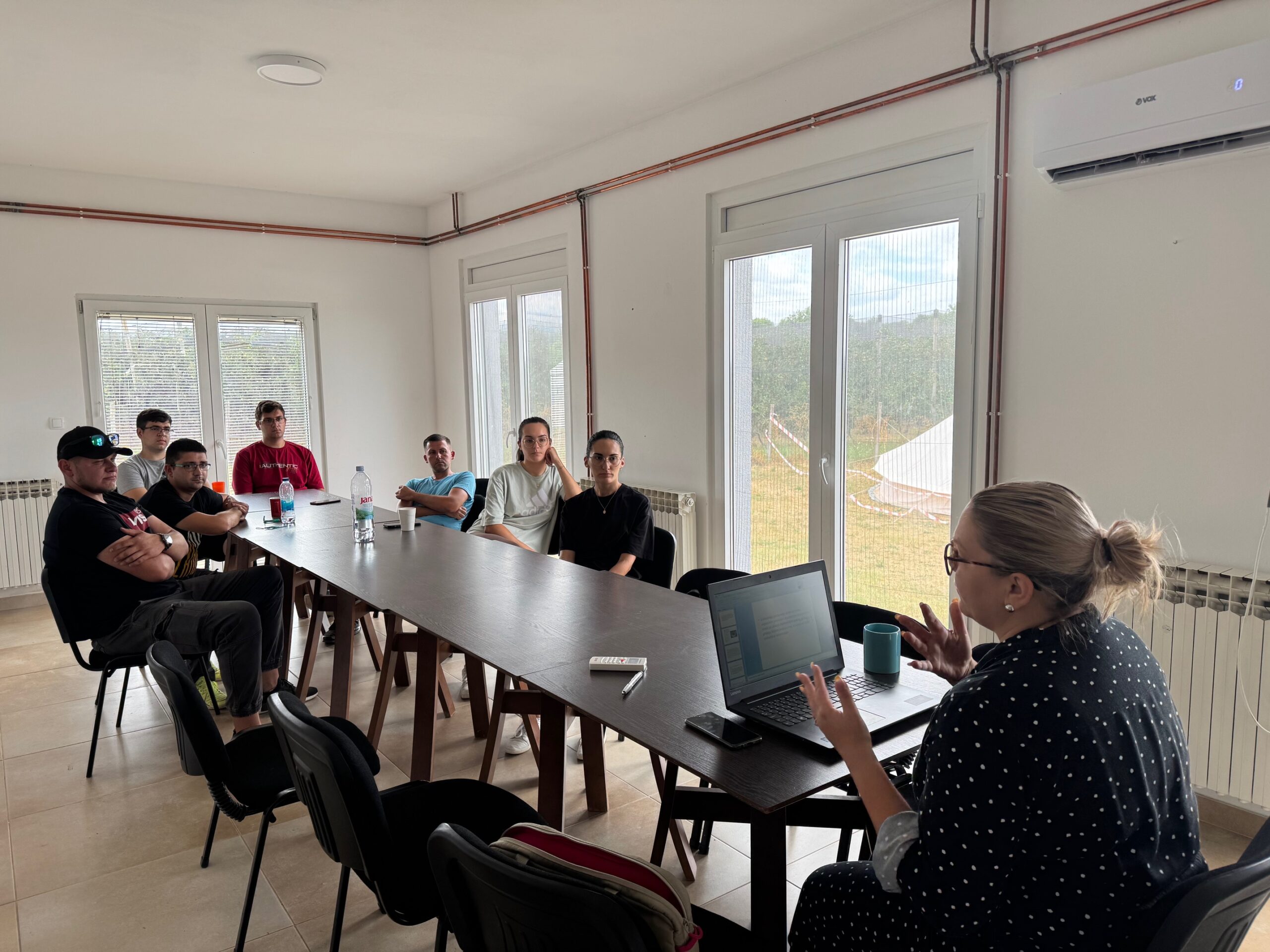 Na praktičnom dijelu edukacije polaznici su sa predavačicom razgovarali o pojavi leda na našem području te zaštiti nasada postavljanjem protugradne mreže koja ima višestruko značenje. O ostalim metodama zaštite je bilo govora na ranijim edukacijama. U nastavku su polaznici privezivali mlade sadnice uz naslon.