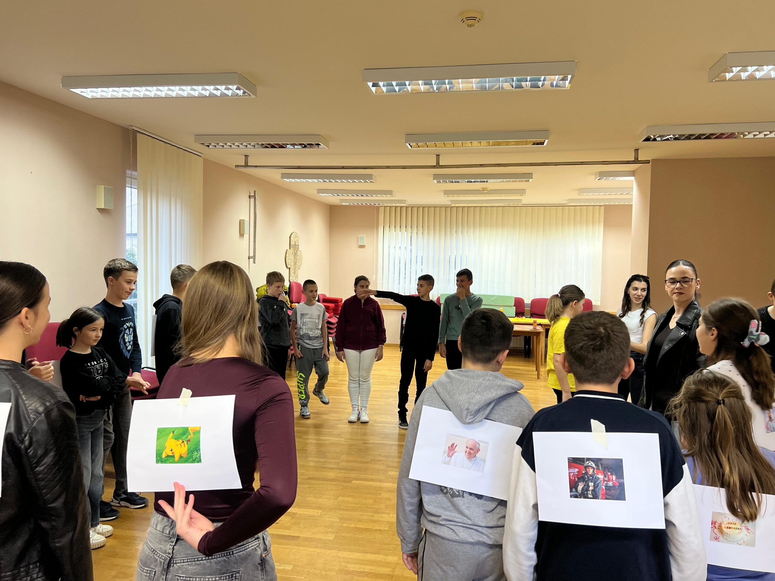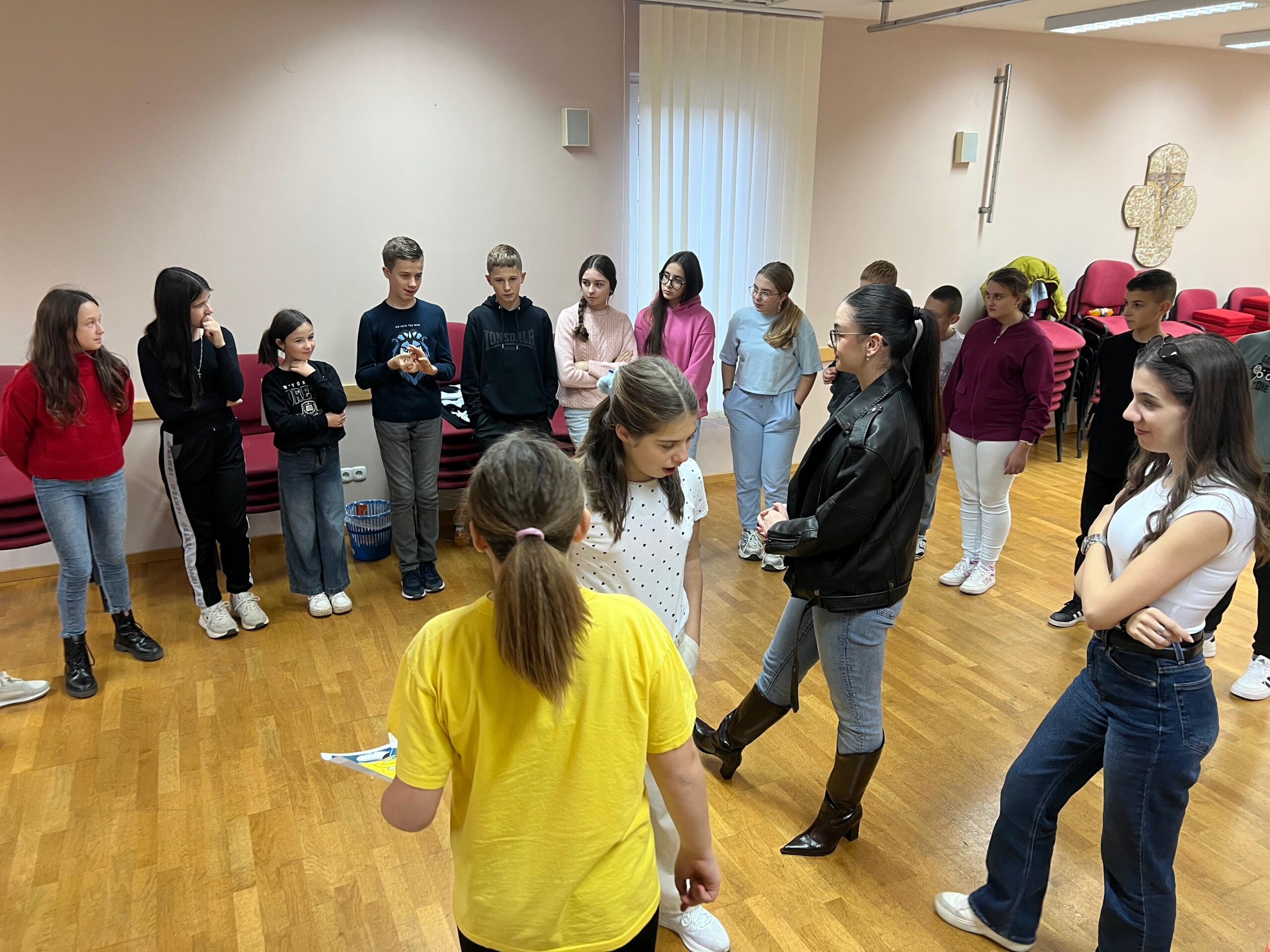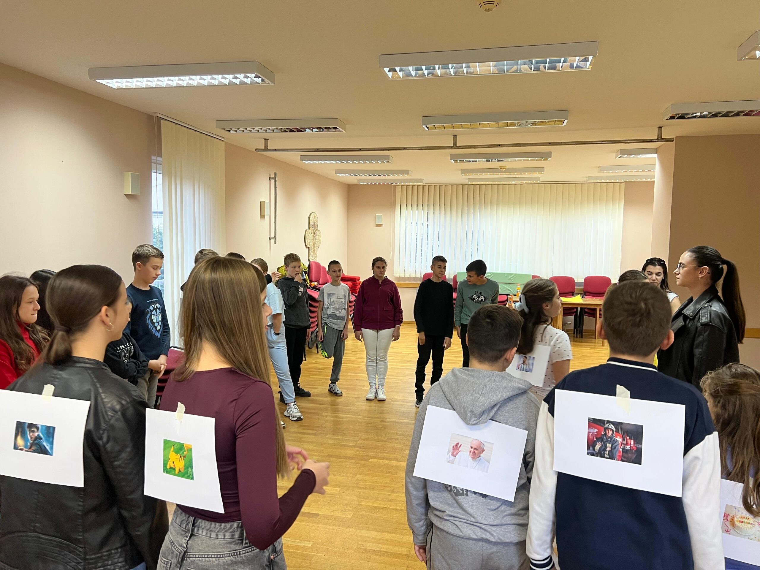 Posebno zanimljiva bila je radionica pantomime u kojoj su djeca na leđima nosila zalijepljene slike, a njihovi suigrači su kroz kratke asocijacije i jednu riječ pokušavali opisati što se na slici nalazi. Pogoditi pojam nije bilo lako, ali su upravo kroz igru i smijeh pokazali koliko timski rad i dobra komunikacija mogu biti zabavni i korisni. Svaki točan odgovor pratio je pljesak, a pogreške su bile povod za još više smijeha i zajedničke šale.